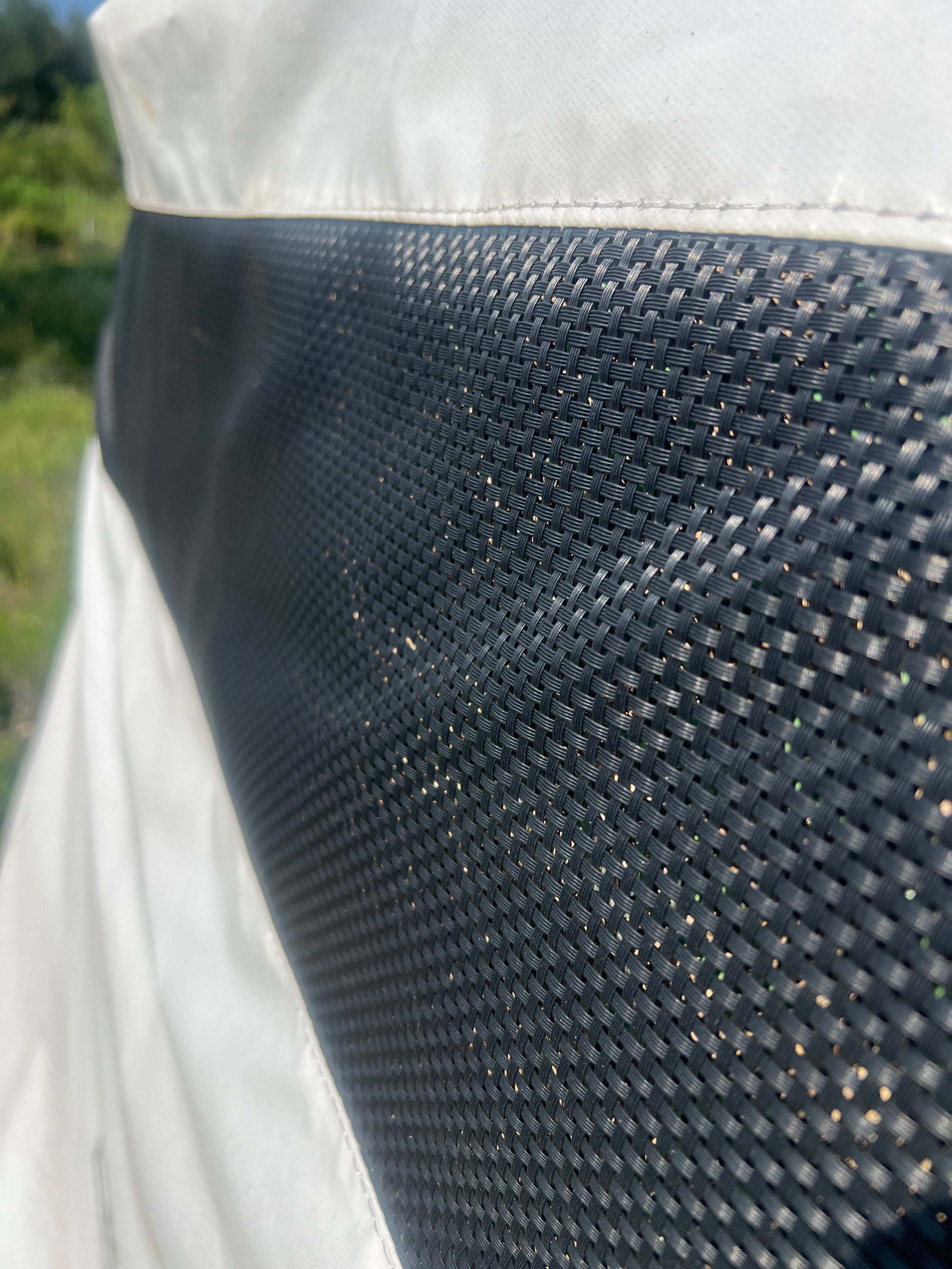 while the mesh will let a small amount of water into the flat side of the bale, it is minor and dries quickly. while our original bale blanket prototype did not have any mesh, we found the overall humidity levels were much higher underneath it, promoting mold. the best compromise was to allow a small amount of water through the mesh to allow for long-term airflow.